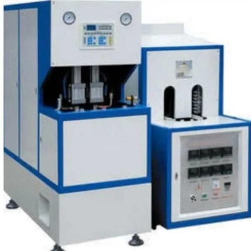 Semi-automatic PET bottle blowing machine with 2 mold cavities. Produces 700-900 BPH for bottles ranging from 200-2000 ML. Requires 24 kW power.