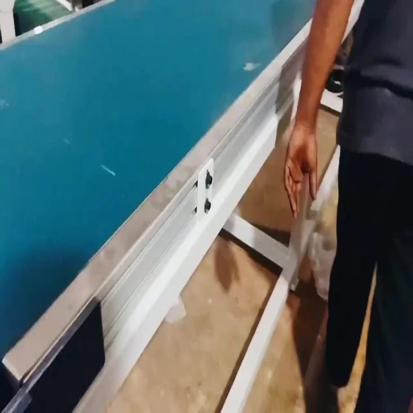 Specialized PVC belt conveyor for pharmaceutical applications. Features a 12 mm thick belt and a 100 kg/m capacity for safe product transfer.