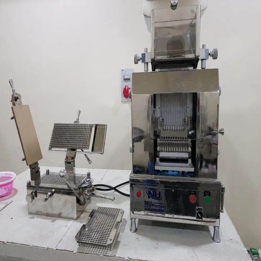 Automatic capsule filling machine for pharmaceutical use. Constructed from SS 316L stainless steel, operates on 220V electric power. Made in India.