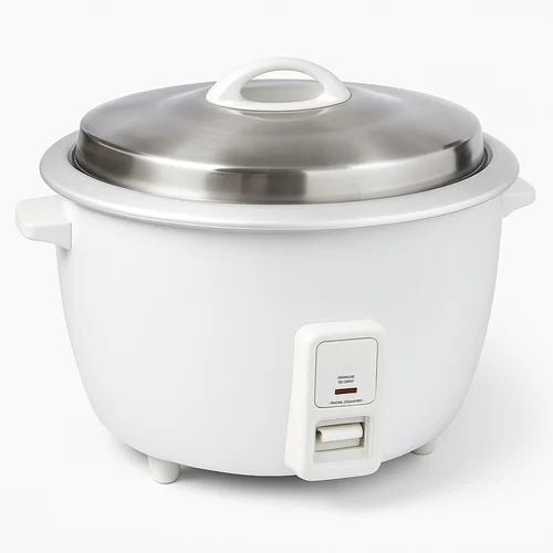 White electric rice cooker, model Electric Rice Cooker, manufactured in India. Comes with a 1-year warranty. Designed for efficient rice cooking.