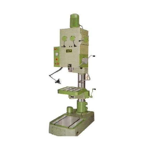 All-geared pillar drill machine with auto feed. Features a 1.5 HP drill head motor, 38mm drilling capacity in C.I., and 1120mm distance from spindle nose to base.