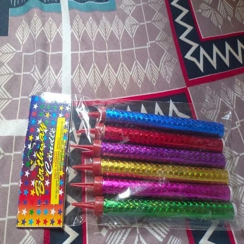 Multicolor pillar candles made from gel wax, 15cm in dimension. Features fragrance. Packaged with 6 pieces per packet, suitable for birthdays.