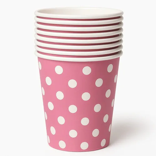Disposable paper cups, 150ml capacity, in pink and white. Printed pattern on 180 GSM paper. Suitable for parties. Minimum order of 100 pieces.