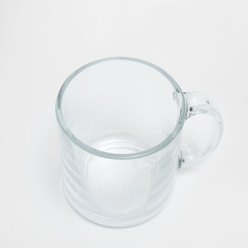 A plain, transparent glass mug designed for home and office. Microwave safe for convenient use, made from durable glass material.
