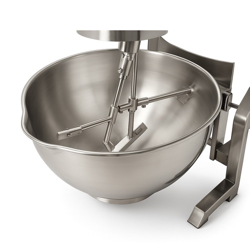 100L steel planetary cooking kettle for mixing. Features 1HP motor, electric tilting, Teflon scraper, and three-phase power. Dimensions: 800x850x920mm.