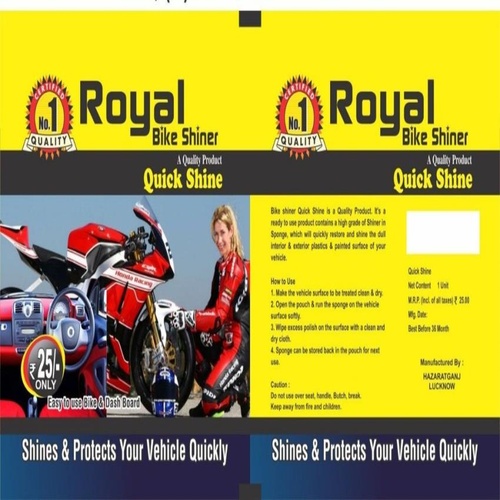 Plastic pouch containing shiner for bikes and auto parts. Designed to restore shine and protect plastic surfaces. Compact and convenient packaging.