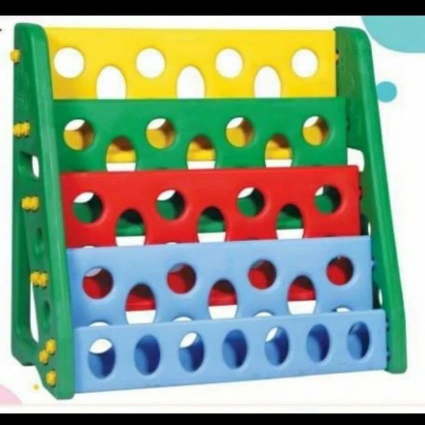 Plastic book shelf designed for organizing children's books. Durable and lightweight construction for easy placement. Suitable for home or classroom environments.
