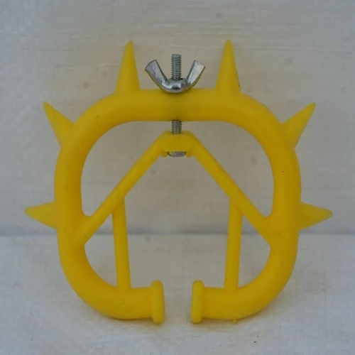 Yellow plastic cow weaner ring, manual operation. Designed to prevent calves from drinking their own milk. Durable material for effective animal management. Sold in minimum quantities of 5 pieces.