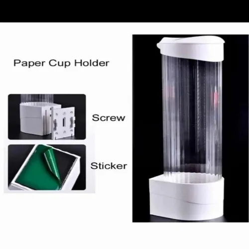 Manual plastic cup holder, white, holds 40 cups. Features 7.6 cm cup norm, 428mm height, 98mm length, and 85.2mm width. Ideal for paper cups.
