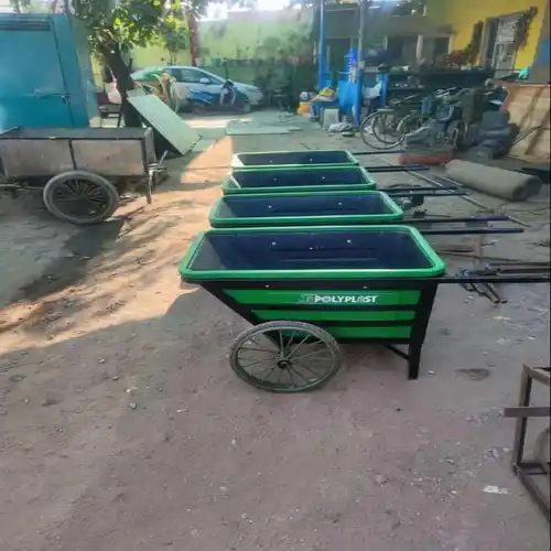 Green plastic wheelbarrow with two solid tyre wheels. Offers a 150 kg load capacity and is made of durable HDPE for construction applications.