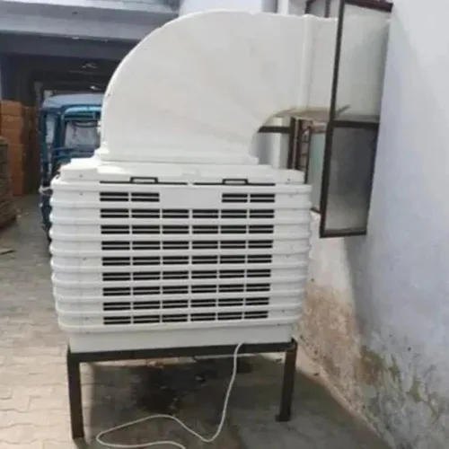 Plastic duct air cooler for industrial/commercial use. Measures 1100 x 1100 x 980 mm, operates on 220 V, 50-60 Hz with a 35 Ltr tank capacity.