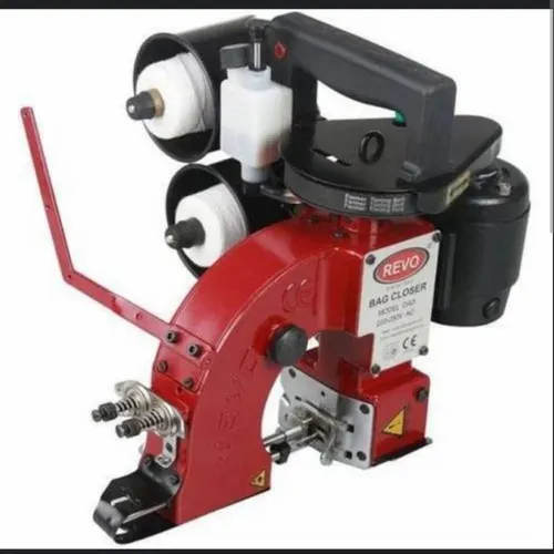 Double needle bag closer for plastic and jute bags, cast iron article, grey color. Operates on 220V with a weight of 7KG. Capacity dependent on operator. Made in India.