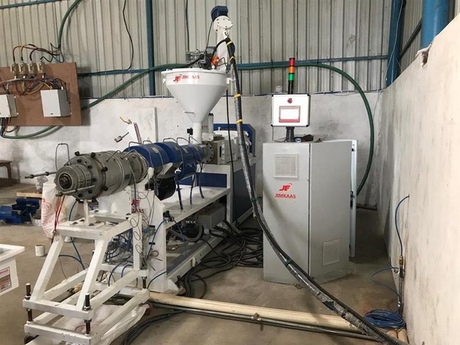 Fully automatic PVC twin screw extruder machine for industrial plastic extrusion. Operates at 55 Hz. Made in India.