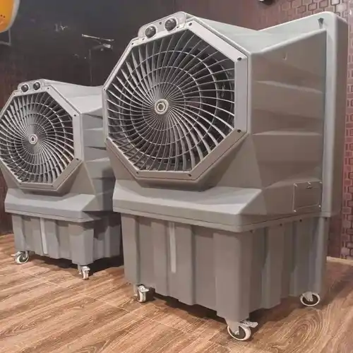 Plastic tent air cooler. Features 100 L tank capacity, 20-inch blades, 2 HP motor at 1800 RPM, and 10 dB noise level. Operates at 240V.