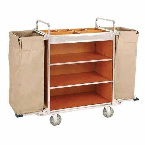 Hotel-grade material handling trolley. Features a platform structure made of SS/MS/Powder Coating, with a loading capacity of 0-50 kg.