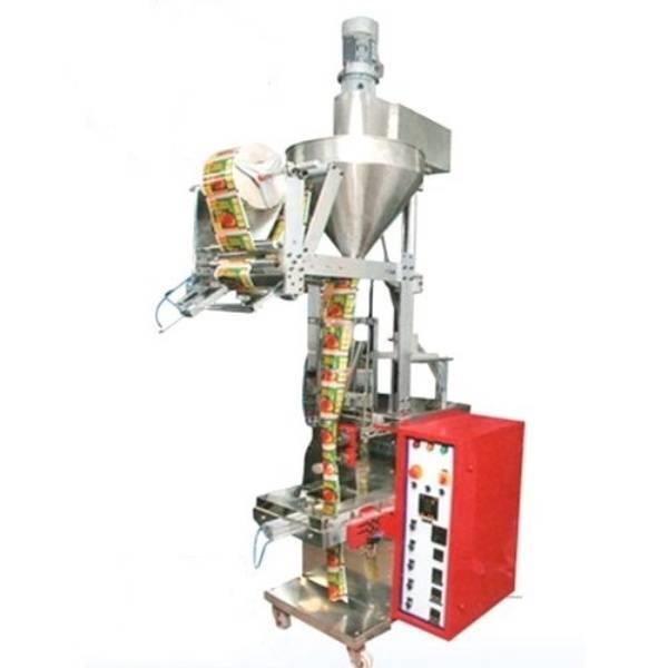 Automatic PLC-based pneumatic packing machine with electric drive. Operates at 220V and achieves a capacity of 35 pouches per minute. Dimensions are 8x3 Ft.