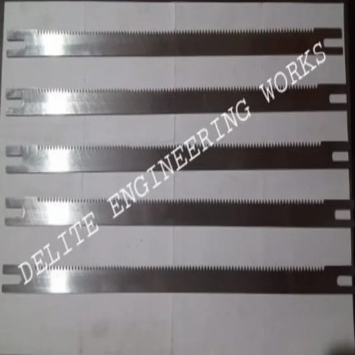 Rectangular pneumatic cutting blades, 1mm to 5mm thickness, with a ground surface finish. Designed for pouch packaging and cutting applications. Made in India.