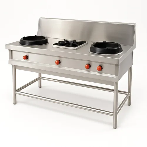 PNG gas commercial cooking range with 3 burners and SS 304 grade stainless steel. Electric power source, made in India for restaurant applications.