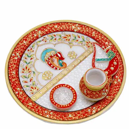 This polished, round marble thali is available in white. Its durable marble construction and round shape make it ideal for various uses. Packaged in a box for secure delivery.