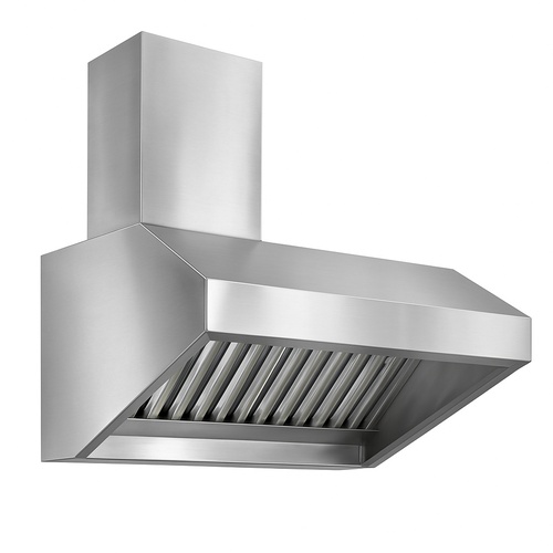 Wall-mounted SS 202 polished stainless steel exhaust machine for commercial kitchens. 500 CFM capacity, anti-corrosive, 220V electric power.