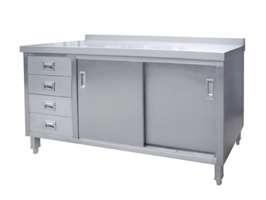 Polished stainless steel table drawer for restaurants. Rectangular shape with 4 wheels and 4 drawers. Table top also stainless steel. Minimum order quantity: 10.