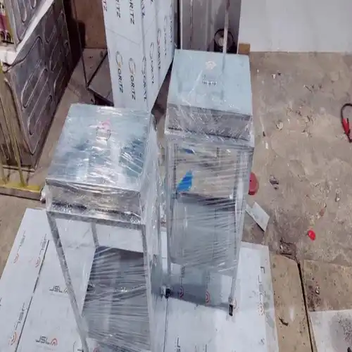 Polished stainless steel masala trolley with one shelf. Silver colored and standard size, this equipment provides durable and organized storage for kitchen spices.