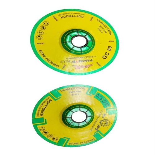 Yellow and green polished stone wheel for construction. Made with mild steel, round shape, and 1-year warranty. Suitable for building applications.