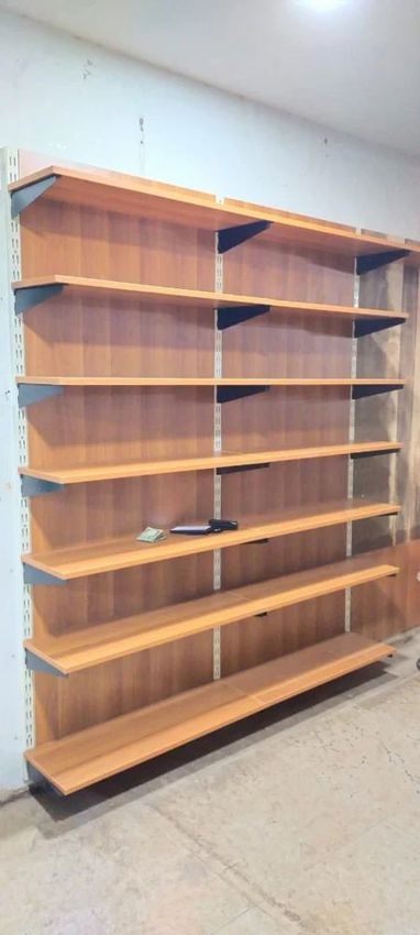 Seven-shelf wooden wall-mounted shelving unit with a polished natural finish. Provides ample display and storage space. Sturdy construction for secure wall mounting.