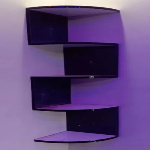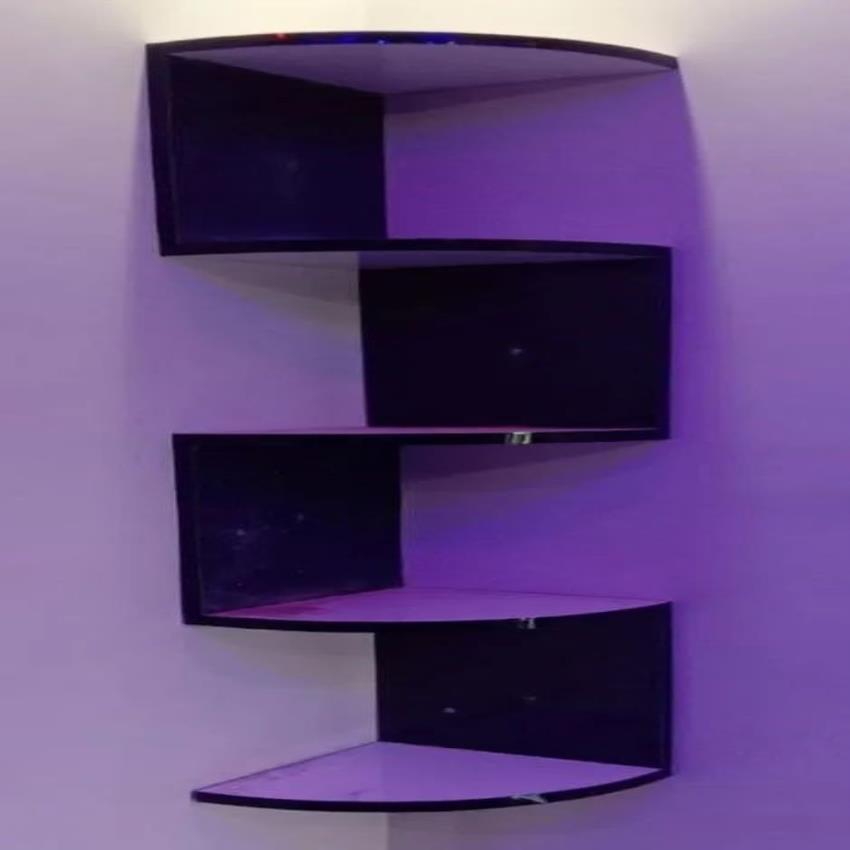 Zig-zag designed wooden corner shelf with a polished black finish. Features 4 open shelves, wall corner mount type, and modern appearance. Requires no assembly. Ideal for living hall spaces.