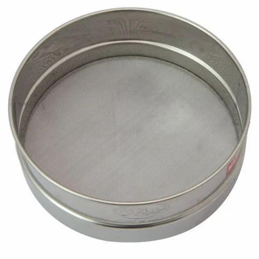 Durable silver stainless steel sieve for home use. Features a solid construction with no copper base for reliable performance. Ideal for everyday kitchen tasks.