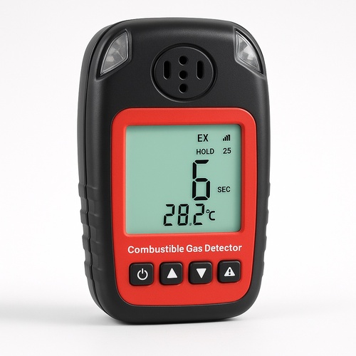 Portable combustible gas detector with digital display. Detects natural gas, propanol, and CO. Measures 0-100% LEL. Battery-powered for manual operation.