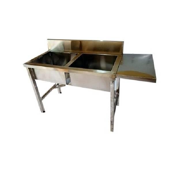 Portable, silver stainless steel kitchen sink with a rectangular shape and double bowl configuration. Made in India. Offers convenience and ample washing space.