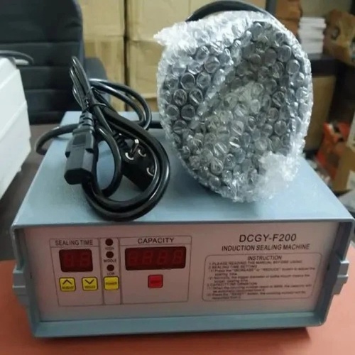 Manual portable induction sealer (DCGY-F200) with plastic body. Seals caps from 20mm to 120mm at 140V. Weighs 2kg.