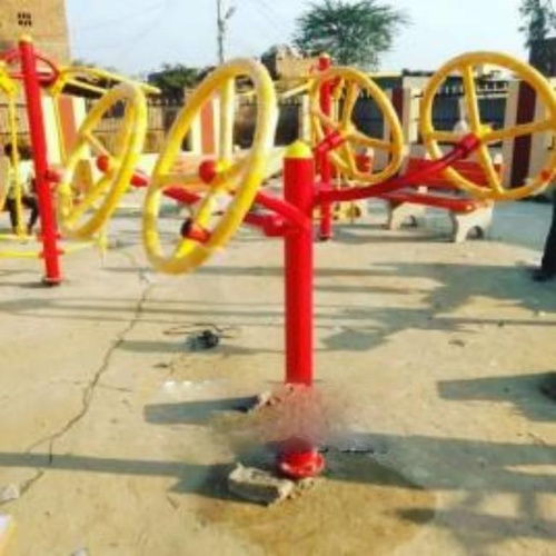 Portable iron Tai Chi wheel for gym and outdoor use. Features semi-automatic operation and customized color options in yellow and red. Made in India.
