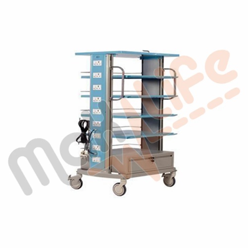 Blue, non-foldable Max-Life monitor trolley for hospital use. Features 4 shelves and portability for easy medical equipment relocation. Square shape.