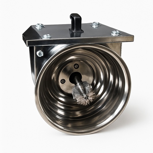 Silver portable coconut scraper machine made of stainless steel. 220V voltage, capacity of 10 coconuts. New only.