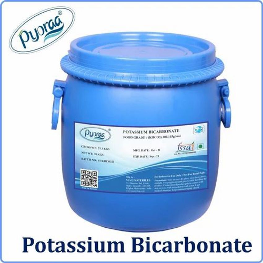 White, food-grade potassium bicarbonate powder in a 30KG wide-mouth drum. Sourced from U.S.STERILES, manufactured in India. Ideal for food applications.