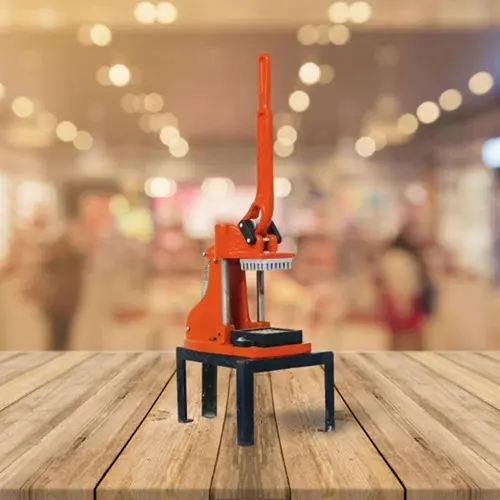 Manual potato chips machine, up to 25 kg/hr capacity. Stainless steel components and blades. 13 Kg weight, dimensions 15*30*7. Made in India.
