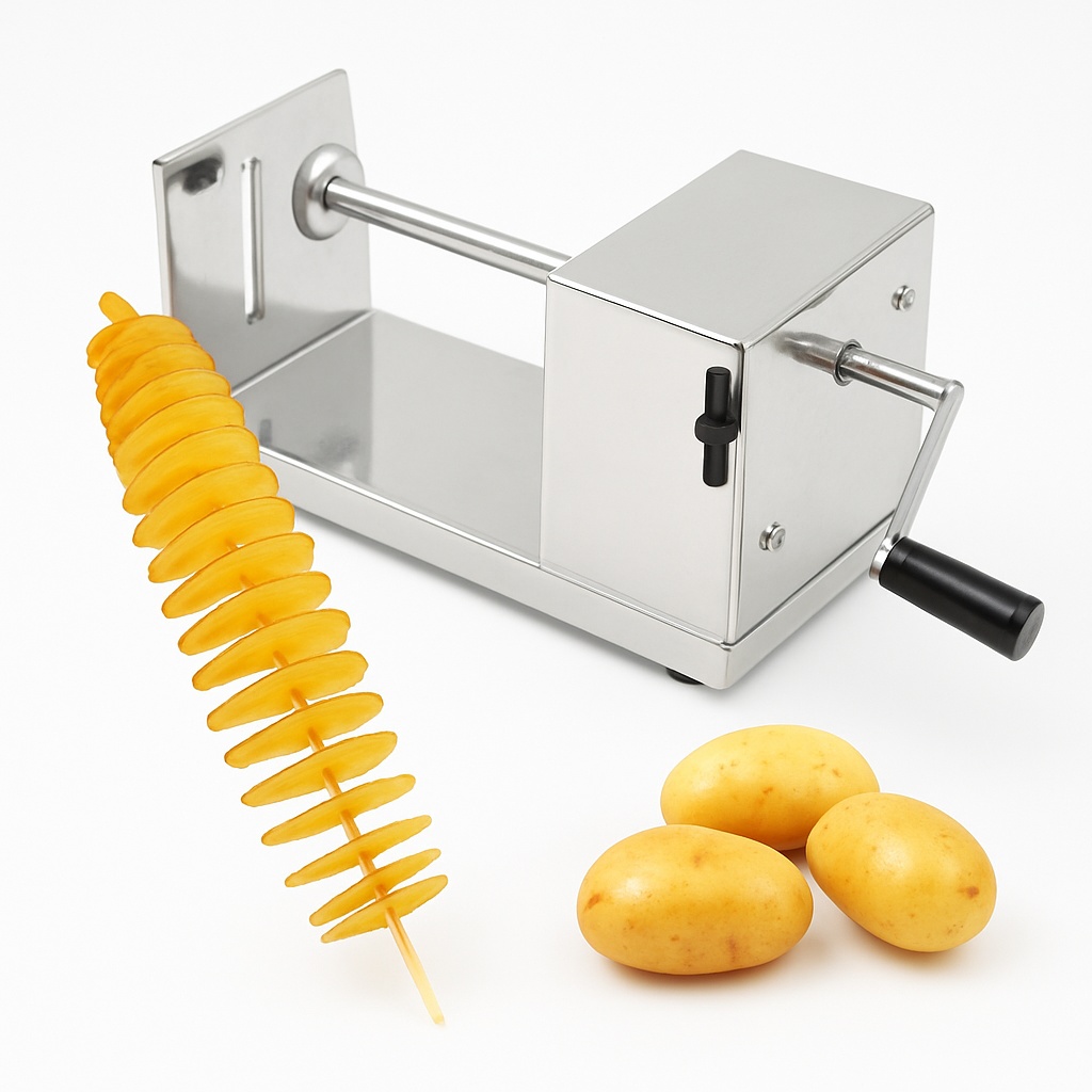 Compact potato twister machine for creating spiral potato cuts. Simple operation for unique food presentations.