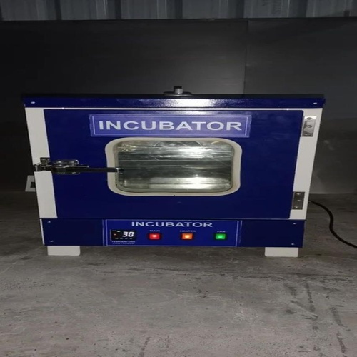 Mild steel laboratory bacteriological incubator, powder coated finish. Operates on 230V AC at 50 Hz, reaching 60°C. Size: 600x600x900 mm. Electric power source.