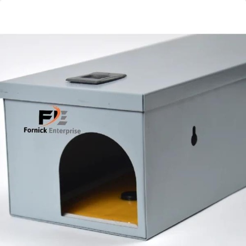 M.S. powder coated rodent bait station in grey. 26 gauge thickness with a 7cm diameter circle. Size: 35x13x11cm. Suitable for food processing, pharma, and hospitality sectors.