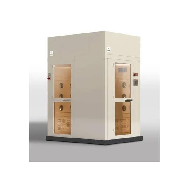 Air shower machine available in powder coated or SS material. Operates at 50 Hz with 1500 CFM air flow and a height of 2600mm. Designed for efficient particle removal.