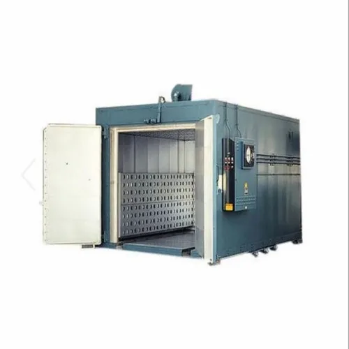 Industrial powder coating curing machine with 1000 Kg max capacity. Features duel air flow, digital display, 32 kW heater, 2 HP motor, and operates on 240 V electrical power. Constructed from mild steel with 1.2 mm wall thickness.