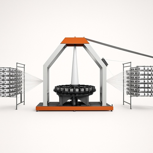 Six shuttle circular looms for PP/HDPE flat tape weaving. Operates at 440V, 50 Hz, three phase, with 6-11 kW power consumption. Semi-automatic, mild steel body construction.