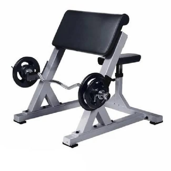 Gymnasium preacher curl machine, 35 Kg weight. Features a forward incline for bisceps targeting. Dimensions: 30 x 38 x 37 inches.