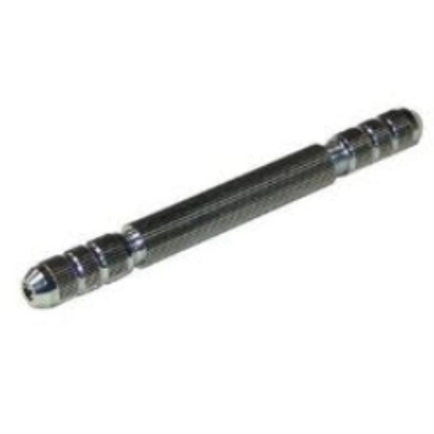 Compact pin vise for holding small objects. Features a rotating handle for precise control. Ideal for crafting, jewelry making, and model building applications.