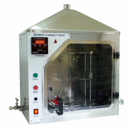 Stainless Steel flammability tester, model PFT-UL-94. Features digital 7-segment display, 999.9s timer, automatic flame stop, and timer auto-start. Supports horizontal and vertical burning tests.