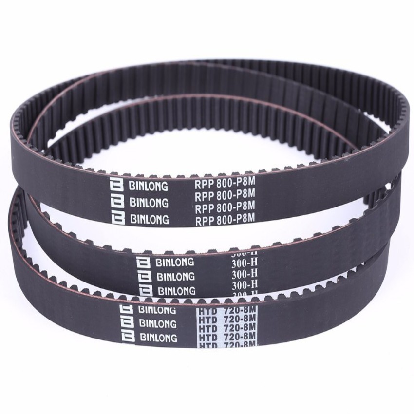 Customizable, manual industrial timing belt. Made from rubber and PVC with a printed pattern. Available in various outer measurements and single/double-sided types.