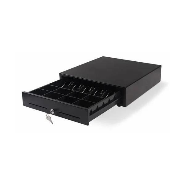 White printer-driven cash drawer for bank use. Features standard tray size, 3-position lock, and IR detection technology. Ensures secure transactions.