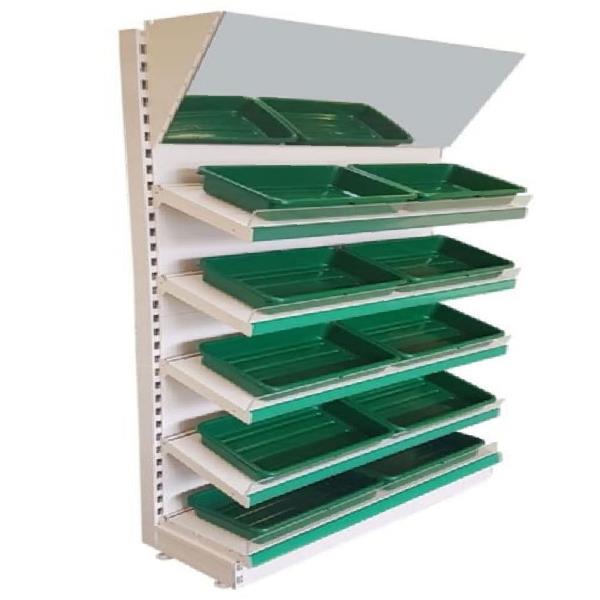 This vegetable rack features durable construction for organizing produce. Designed for efficient display and accessibility in retail environments, ensuring fresh presentation.